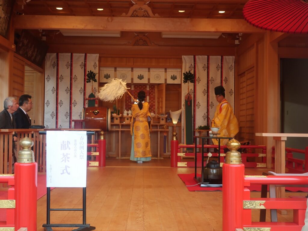 今日から春の例大祭 奉納行事が始まりました。初日の今日は献茶祭。小倉藩ゆかりの古市古流清風会の皆様のご奉仕です。