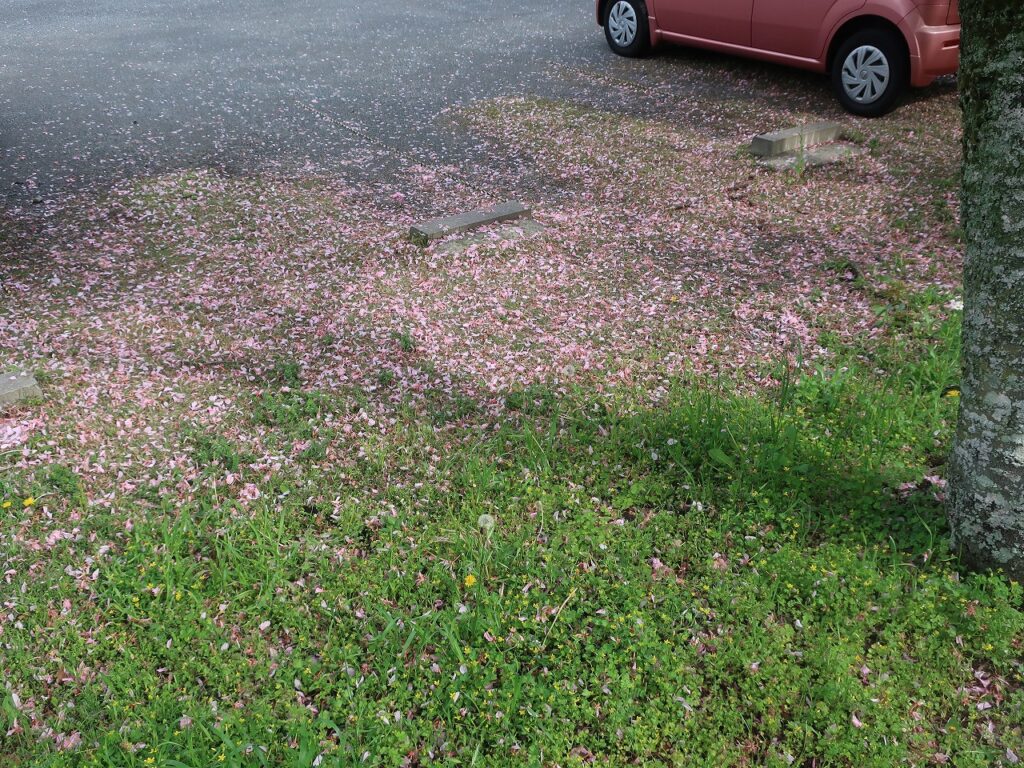 さて、境内はすっかり桜も終わり、新緑の美しさが目に入ります。最後の八重桜もご覧の通り、ピンクのじゅうたんになっています。