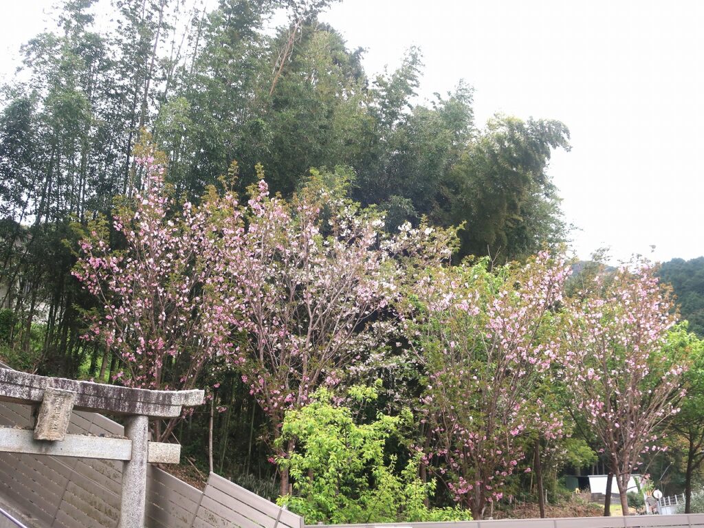 神社第3駐車場の八重桜が一番最後に咲きます。まだちらほらといったところでしょうか。
