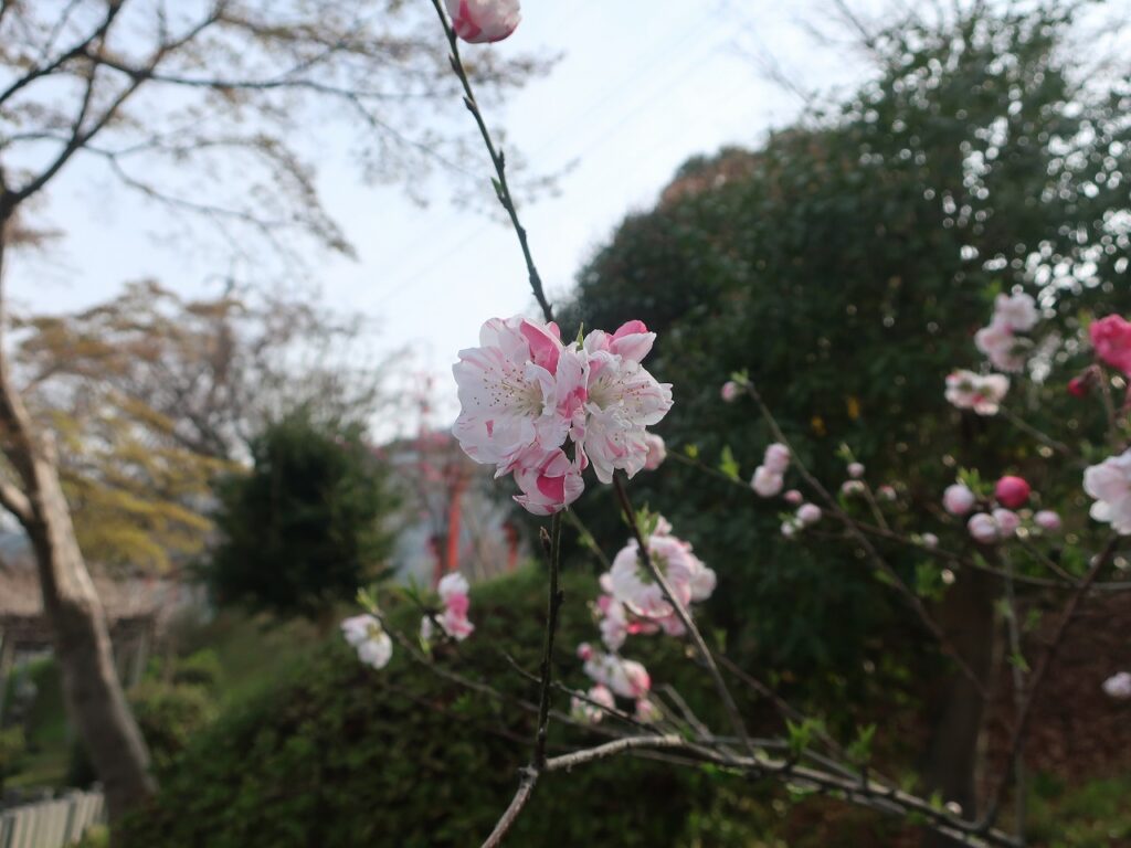境内には桜のほかに、桃の花もございます。写真は車祓処にある桃、源平桃という品種で、一本の木に赤と白の花を咲かせます。以前は枝垂れ源平桃を植樹していましたが、枯れてしまい、現在1本だけ残っています。