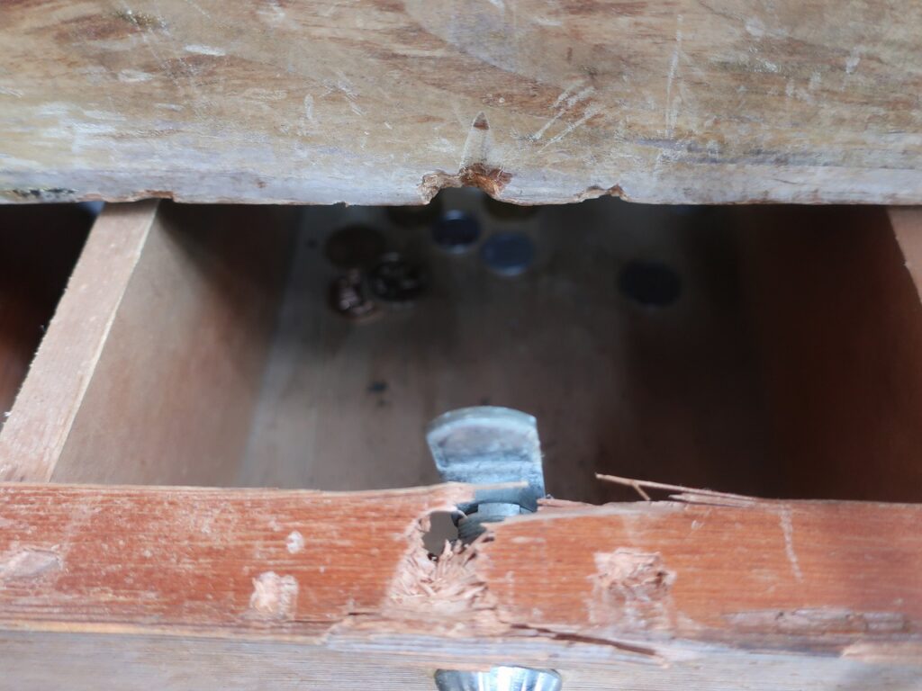 木製の賽銭箱は鍵部分にドライバーを差し込んでの犯行でした。