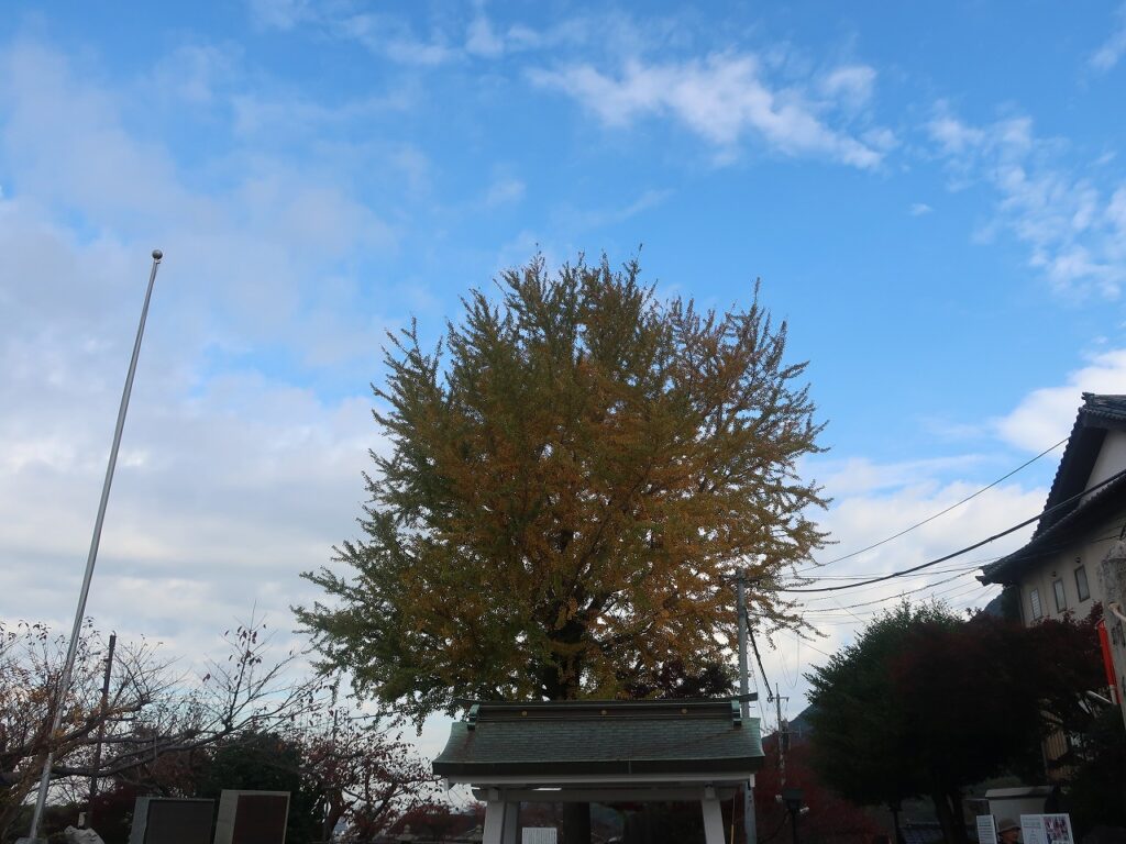 御神木ではありませんが、境内のシンボルである大銀杏の木。三分の二くらい色づいたかもしれません。